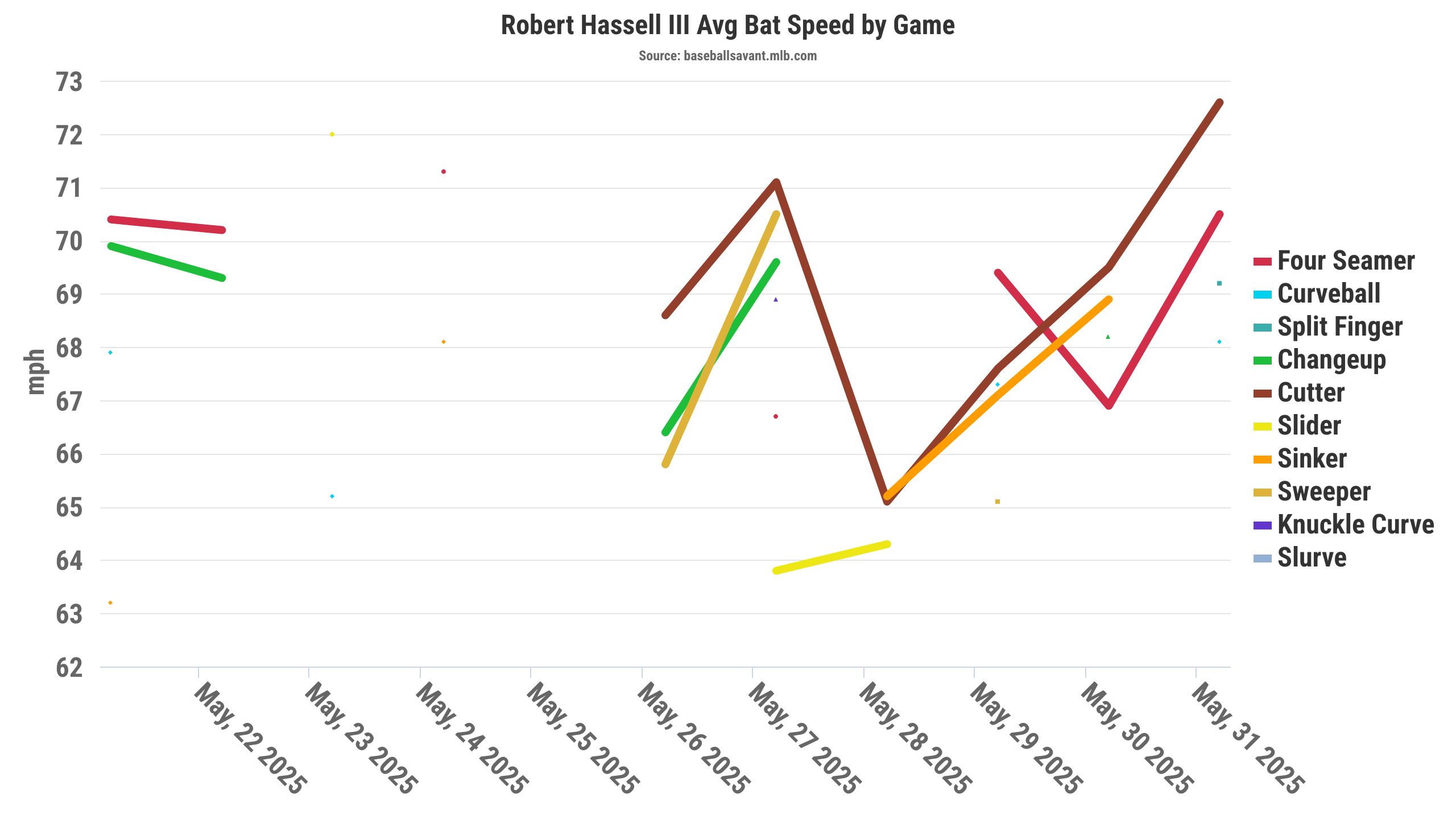 Hassell has slipped into the sixth spot in the Washington lineup and seems to be settling into major league pitching. In his 10 games, Hassell is hitting .268 with a home run, six RBI, five runs scored, and one stolen base. He has never hit more than 11 home runs in a season, but his calling card is getting on base, stealing bases, and scoring runs. It will be interesting to watch Hassell over the next couple of weeks to see how he adapts to the major league game. Look below. He is adjusting, and his average bat speed is increasing.