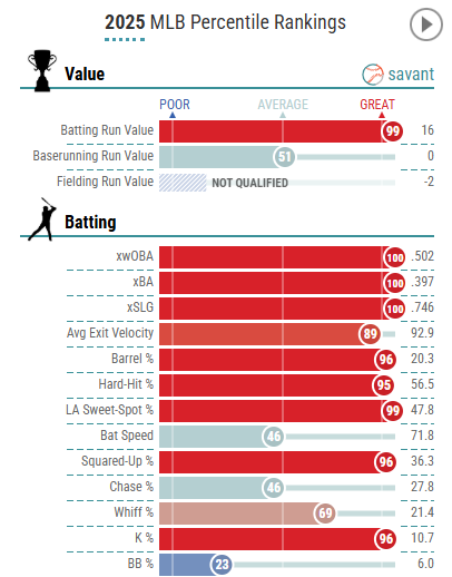 He’s putting up absurd numbers this season with nine HRs in only 87 PAs and a 247 WRC+. He also has a career low 10.7 percent K-rate (excluding 12 PAs in 2015) and one of the reddest savant pages in the league.