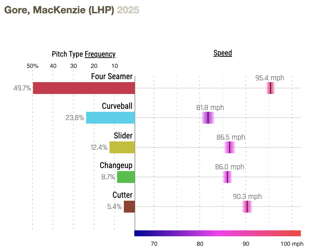 MacKenzie Gore is having the best year of his career, with a 3.16 ERA in 12 starts. He’s also leading all of MLB in strikeouts with 101 in 68⅓ innings, and also leads in K/9 rate at 13.3. He also has a good walk number, just 21. So the Cubs should look to put the ball in play, if they can.