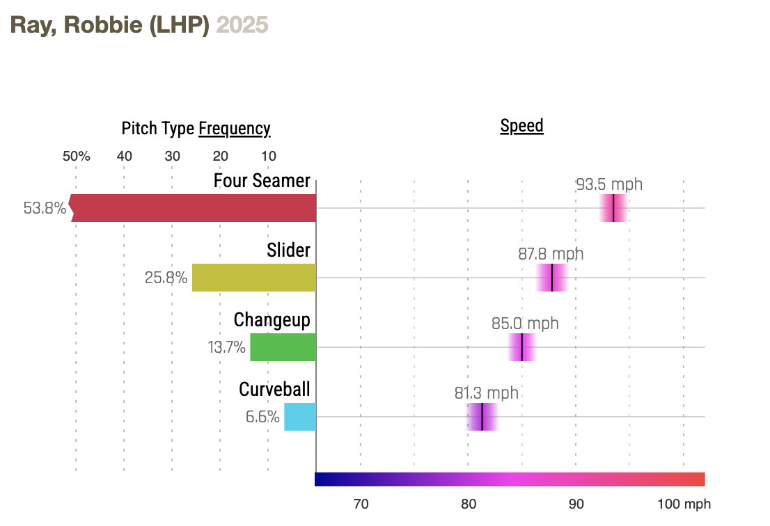 Ray hasn’t faced the Cubs since 2019 when he was a Diamondback and the Cub who’s faced him most is Justin Turner (12-for-45, three doubles, two home runs). Kyle Tucker is 4-for-10 against Ray with two home runs.