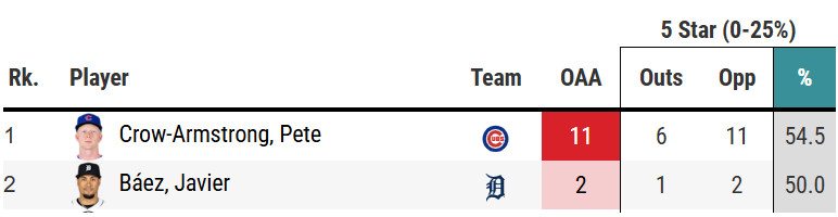 That said, there are very few players in the game who can make the types of plays at all that Pete Crow-Armstrong makes regularly. It’s kismet that one of those players was traded for the other. Javy may wind up playing at third instead of center during this series now that Parker Meadows is back, but it’s baseball perfection to sort a Statcast leaderboard of five-star opportunities and see these two at the top of it.