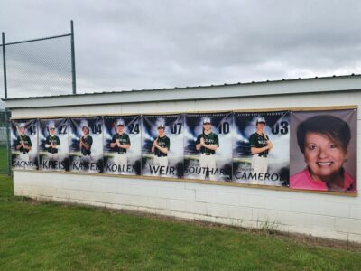 Courtesy Photo The Friends Together Strikes Out Cancer Tournament banner is pictured, featuring the Wildcat players and Friends Together’s founder Judy Burns, who recently lost her battle with cancer.
