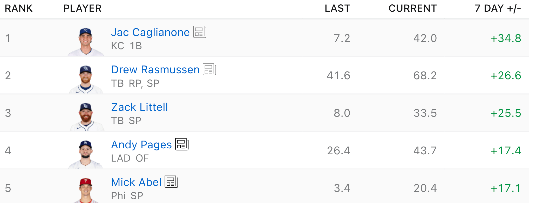 Andy Pages is the new name on here today. Well, not new, he’s been in and out of these top 5s all year, but he wasn’t on there yesterday. Pages has been really hot lately, smoking home runs like crazy. He’s been quite the hot-and-cold player, but playing in the stacked Dodgers lineup certainly adds to his value.