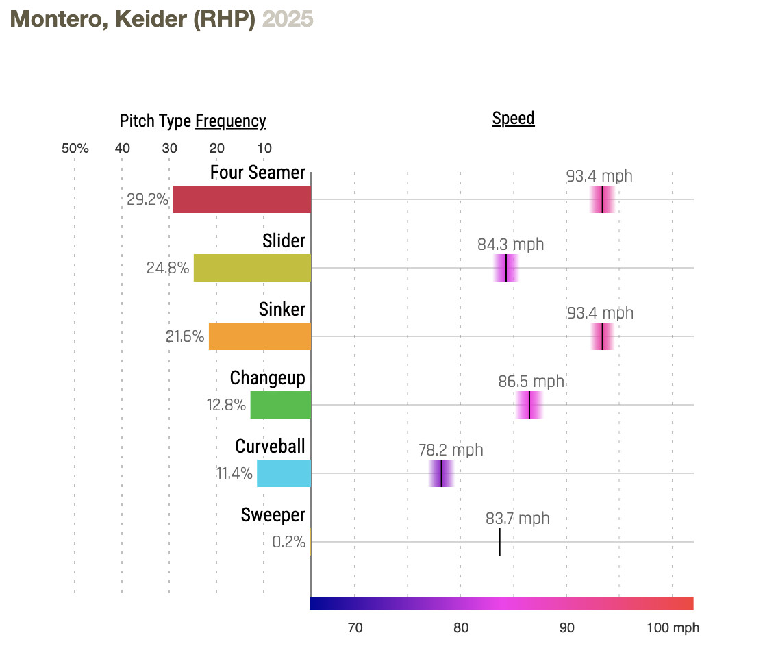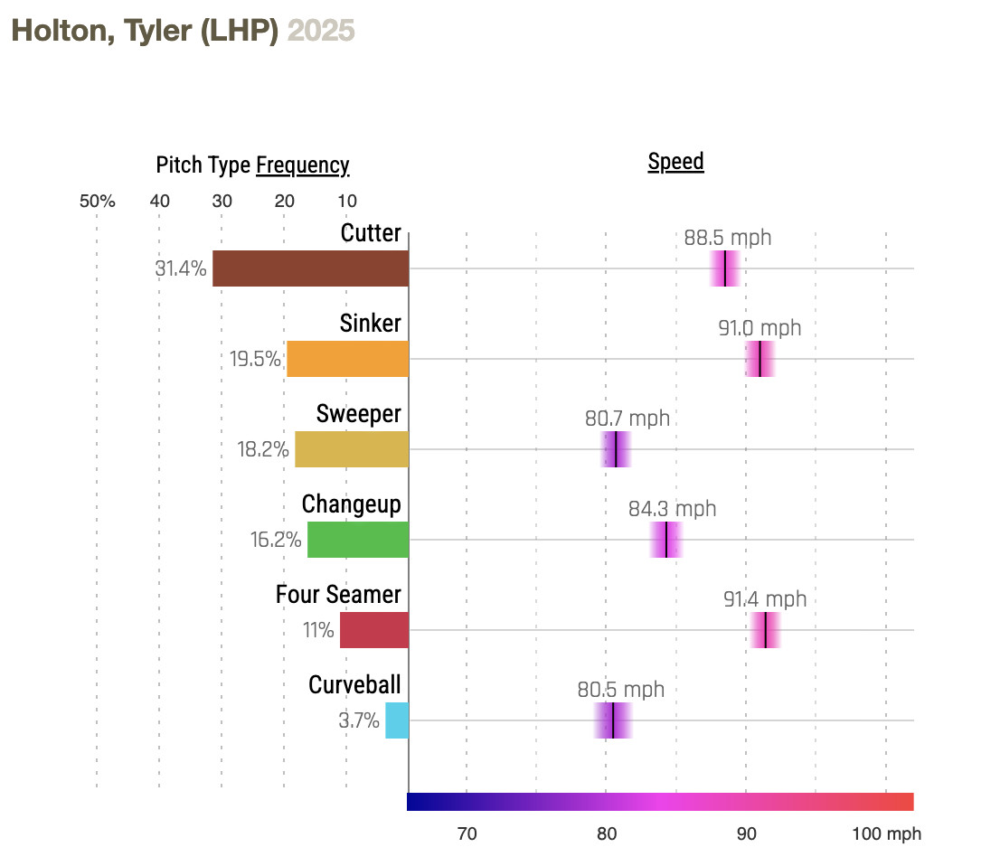 Tyler Holton will be an opener this afternoon, presumably because one of the Cubs’ first three hitters (Kyle Tucker) is lefthanded and Ian Happ, who generally leads off, has less power vs. RHP (though Happ has a better OPS, .756, vs. LHP, than his .699 vs. RHP). We shall see if that works. He is likely opening for Keider Montero, who has a scoreless streak going covering his last 9⅔ innings, in which he’s allowed eight hits and three walks. This will be his first-ever appearance against the Cubs.