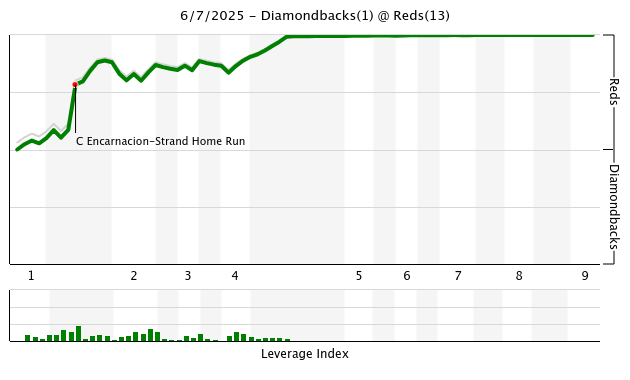 This is another game where the early blowout nature of it basically borks the entire WPA algorithm. For instance, Reds designated hitter Gavin Lux, despite his grand slam to really put the game out of the reach in the bottom of the fourth, wound up with a -1.8% WPA for the game. I mean, really? Really? How?