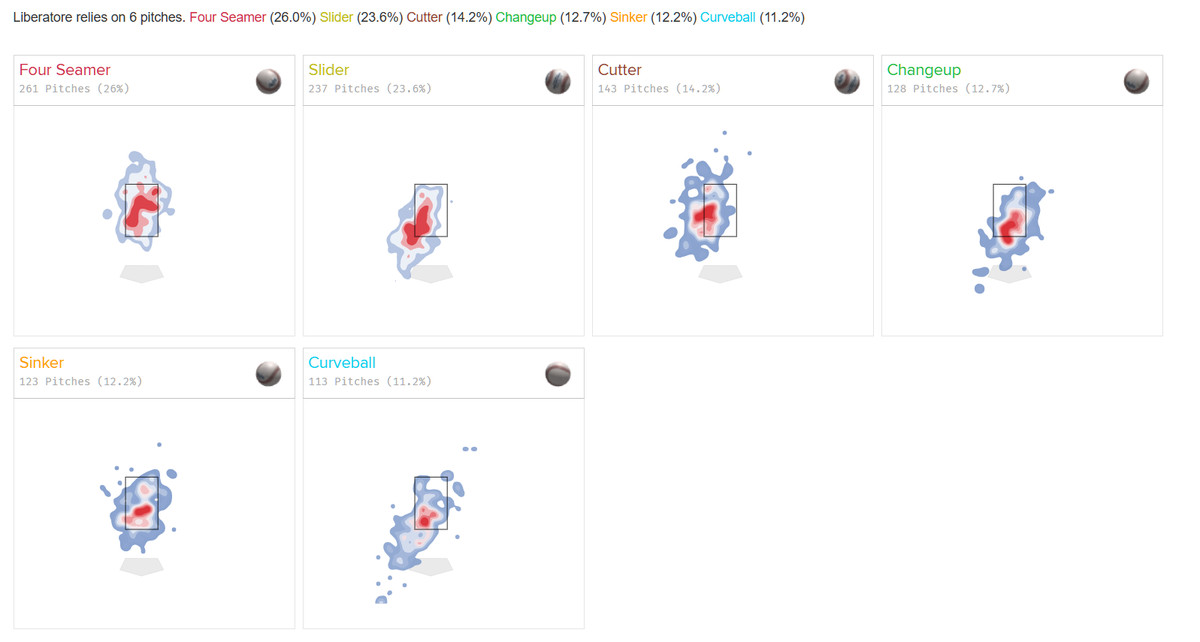 Liberatore’s fastball has never been overpowering, but this year, he’s using it with surgical precision. Sitting at 94.4 mph, his four-seamer is finding the corners consistently, setting up everything else in his arsenal. You can see it very clearly in the Illustrator from Baseball Savant: