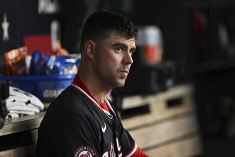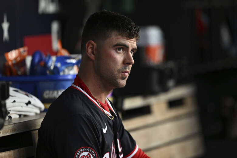 Washington Nationals pitcher MacKenzie Gore looks on from the dugout during a baseball game against the Chicago Cubs in Washington, Wednesday, June 4, 2025. (AP Photo/Terrance Williams)(AP/Terrance Williams)