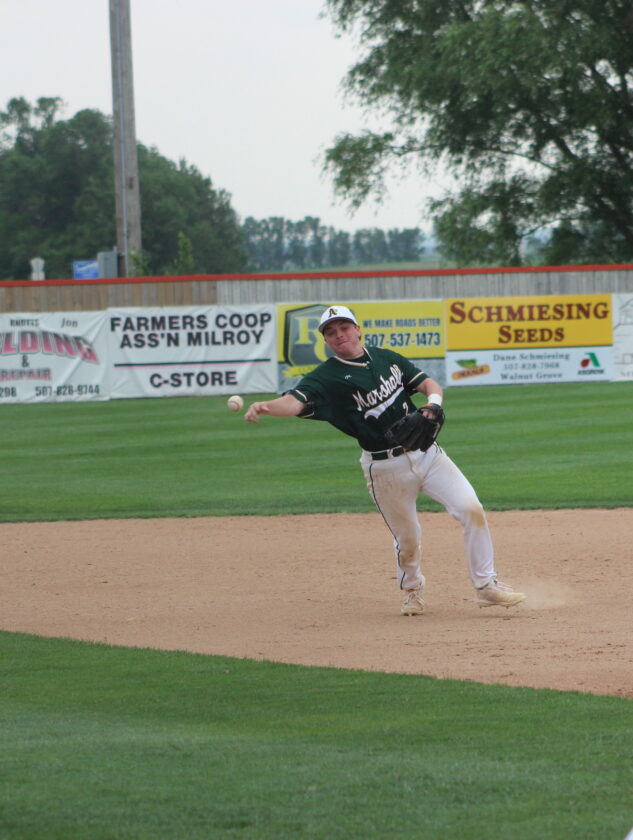 Photo by Samantha Davis. Marshall A second baseman Dillon Loft throws the baseball to first base against the Milroy Yankees Sunday night in a Corn Belt League game at Yankee Field. The A’s defeated the Yankees 9-3.