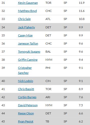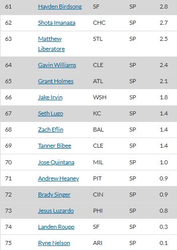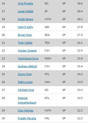 Logan Webb (17) – To be honest, any of the names in this section could jump into the top tier as soon as this week. Logan Webb is no exception. The Player Rater values wins more highly than a lot of other data systems, and if the Giants gave Webb more run support, his 5-5 record would be more like the 8-game winners in the top tier. He’s also one of the 15 SPs with a 10+ K/9.