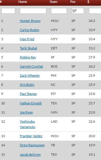 Hunter Brown (1) – Whoa! If you tuned in today expecting to see a different #1 in our rankings, you might be a bit confused. We could argue that Tarik Skubal, Zack Wheeler, or Paul Skenes should be atop the list, but the Player Rater took all of the data into account and calculated our top academic of the first term. With just four SPs in the $30 ranks, Hunter Brown’s $34.3 narrowly ekes out his peers for the top spot today. The strikeout rate is the highest it’s ever been (10.54 K/9), and his ratios are pristine. There may be more popular names in the school trophy case, but this one is poised to take top honors if he keeps working hard through the rest of the year.