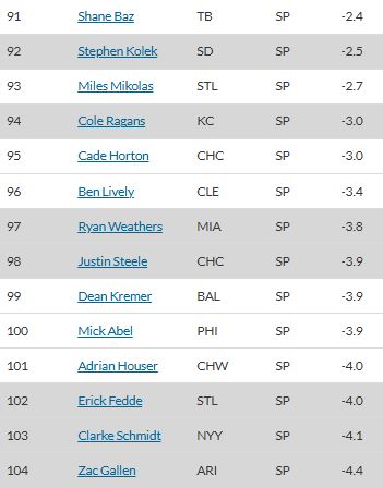 Shane Baz (91) – 5 wins in 12 GS and fewer strikeouts than innings pitched? That’s not a good way to get yourself to the head of the class. Baz’s quality start percentage is just 33%. He has a lot of extra credit work to do to bring those ratios down.
