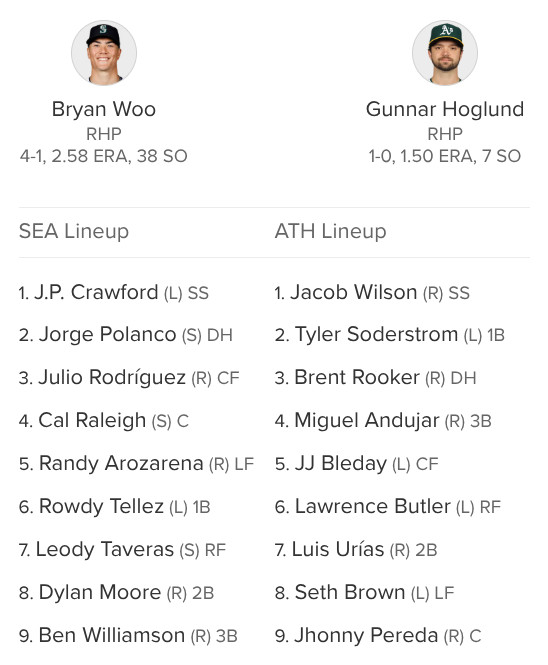 Randy Arozarena returns to defensive duty in left and Leody Taveras makes his Mariners debut in right. The A’s shake things up, with the hot-hitting Jacob Wilson moving to the leadoff spot.