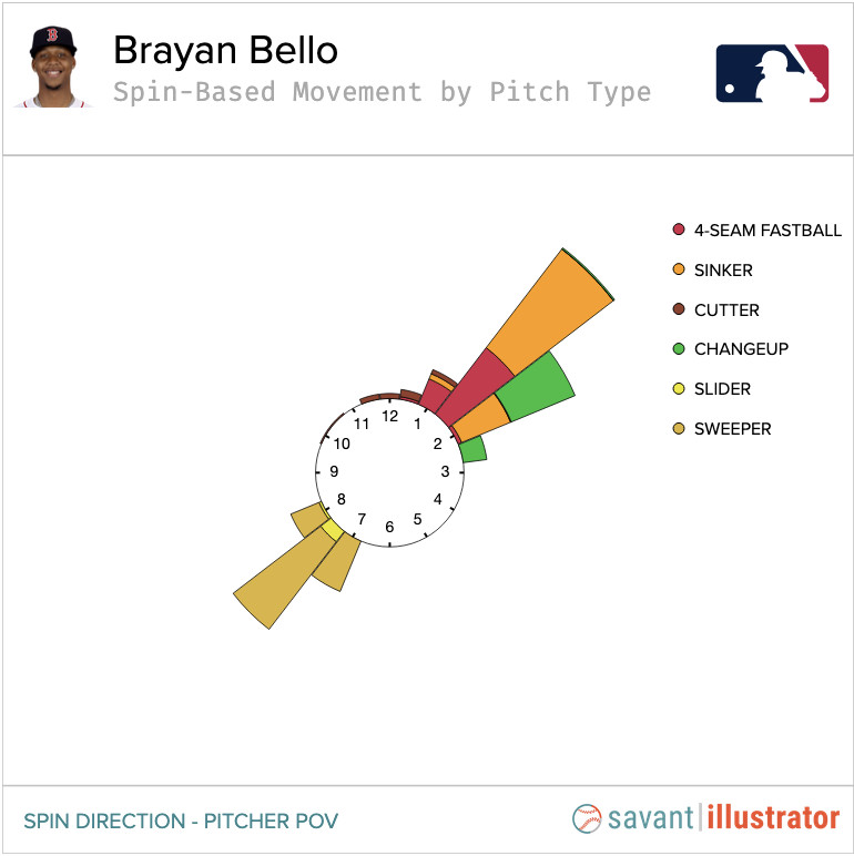 This has worked because of both the makeup of the pitches themselves and the different ways in which Bello uses them. I think the location of his sinker is more directly impactful, as we saw in his start against the Rays on Monday, as he’s really refined his placement of it over his last few starts. Focusing on using this as a strikeout challenge pitch and not a chase pitch has, in turn, amplified the effectiveness of his sweeper. He can instead use the sweeper as a chase pitch to generate swings and the sinker as a pitch to dot and challenge hitters.
