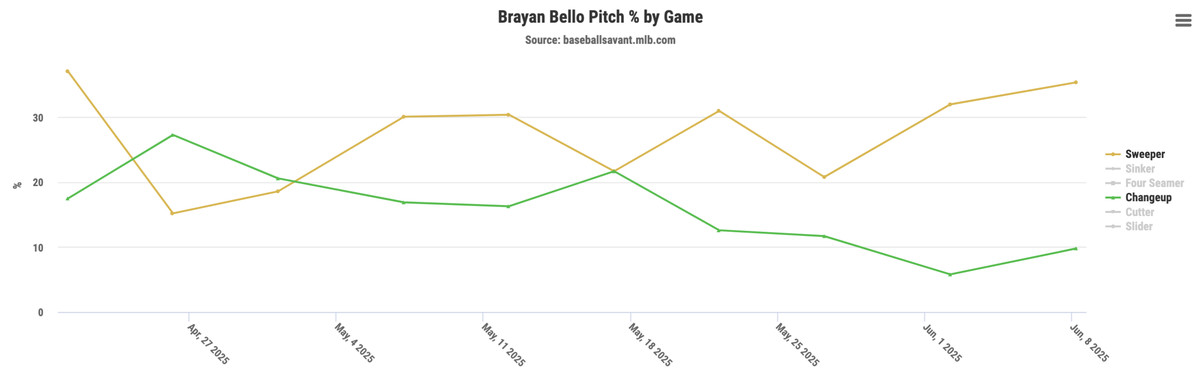 After deploying his sweeper and changeup at similar rates last season, Red Sox starter Brayan Bello’s changeup has completely fallen off this year. This has led to his sweeper becoming his prominent off-speed pitch by far since the second half of May.