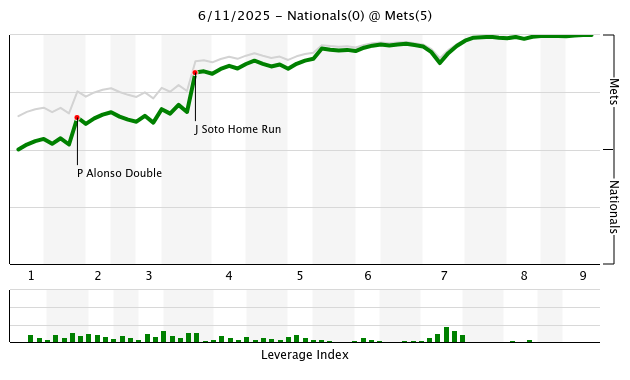Francisco Lindor set the table with one out in the third with a well-struck double into the right field corner, and Juan Soto rewarded him with a nice jog around the bases. Soto, who has been excellent as of late, hit his second home run in two days against his former club, (and in his fourth straight game at Citi Field), taking a poorly placed 1-0 Jake Irvin curveball into the right field seats to make it 3-0.