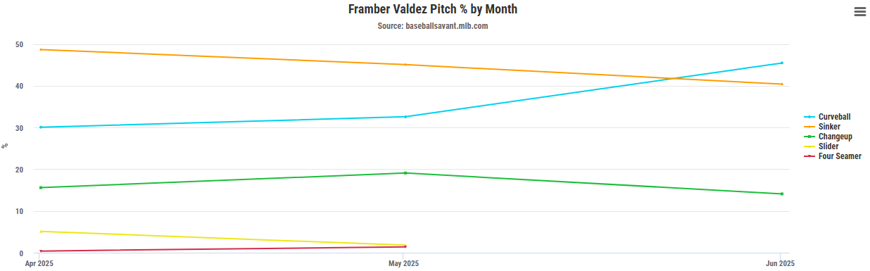 I’ve often referred to Valdez as one of the tougher pitchers in baseball to figure out, because we have seen him go on stretches where he goes sinker-heavy and embraces pitching to contact to go deep into games, but then we’ve also seen him embrace his curveball and go after big strikeout totals, too. Right now, he’s doing the latter and getting elite results.