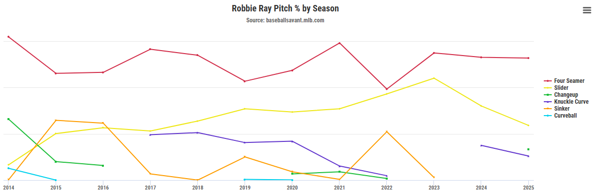 The last few years on this chart are all that matter for our discussion of the latest iteration of Ray’s arsenal, but I included his entire career just because it’s kind of cool to see how many different times he has tweaked his pitch mix in the search for a combination that best suited him. This is a true evolution of a pitcher as Ray hasn’t been afraid to experiment with his third and fourth offerings, while the fastball and slider have been the two pitches that have made up the bulk of his arsenal throughout the years.