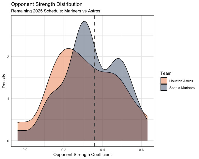 As John Trupin noted on the site on Wednesday, the Astros have the weakest schedule remaining, while the Mariners schedule looks a bit more normal. To illustrate this, I assigned each team a “strength coefficient” based on their WAR per game to date. Here’s the distribution of their upcoming opponents: