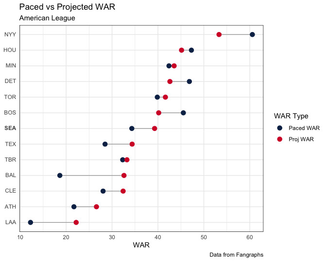 The Mariners through 67 games are about average. The combined wisdom of ZiPS and Steamer suggests, going forward, they’ll be a top 10 team and rough equivalents of the Astros. The top of the Mariners roster looks competitive by both actual and projected WAR. Both systems think Cal Raleigh is overperforming (the only player expected to decline more this season is Aaron Judge), but both agree Raleigh is among the best in the game. The projections still love Julio, even if the highlight of his season so far is cementing his status as an inner-circle, all-time Mariners defensive centerfielder. J.P. Crawford and Randy Arozarena make up a solid 2a and 3a, and the Mariners rotation remains good and deep. We can see how they compare to the Astros by actual and projected WAR: