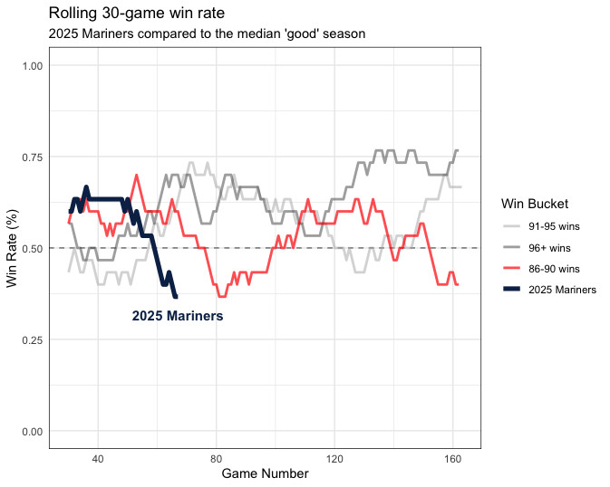 In other words, the Mariners performance in April was indeed notable. It’s not the only good stretch they’ll need this year, but it looks like the foundation of a true contender. The plot also shows their recent slide hasn’t pushed them past the point of no return. If this is the worst they play all season, that would be an “average” cold stretch for a good team. Fangraphs projected the Mariners to win 86 games from the outset, and that result is still on the table 2 1/2 months later. But sometimes downward trends continue. The ongoing skid wouldn’t look out of place in a 70-win season, either. The Mariners have used up their slump for the year. They need to turn things around soon.