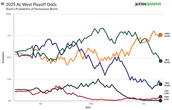 Fangraphs’ playoff odds rely on “Rest of Season” player projections from ZiPS and Steamer. ZiPS continues to think the Mariners are very good, while Steamer continues to think they’re closer to average. Fangraphs uses a 50/50 split between the two, and the following table reflects that.
