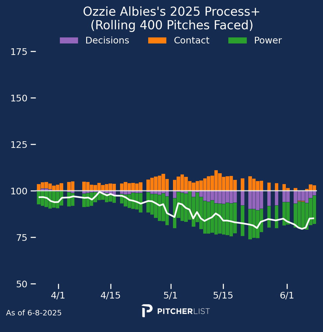 Ozzie Albies had just one steal and one home run May and has one of each so far in June, and unfortunately our PLV data doesn’t suggest things are turning around. The upside we’ve seen in past years keeps him ranked, but he continues to tumble the longer he goes without showing us anything to hang our hats on.