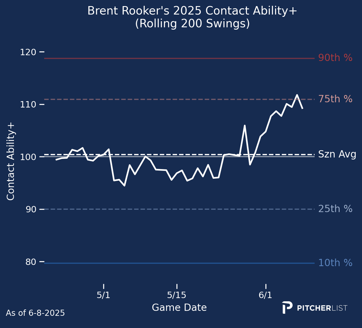 I had Brent Rooker well inside the top-20 in the preseason and am excited to see him showing the kind of potential we saw in our research. The growth this season is driven primarily by improved contact ability. Even modest improvements in contact ability for an extreme power hitter like Rooker (or the previously mentioned Greene) can have enormous dividends.