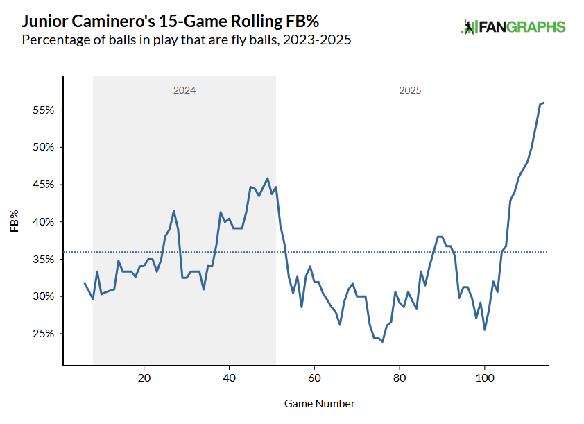 Junior Caminero needed to hit more fly balls and by Jove that’s what he did. Whenever that fly ball rate is above 40%, you’re going to see very special results.