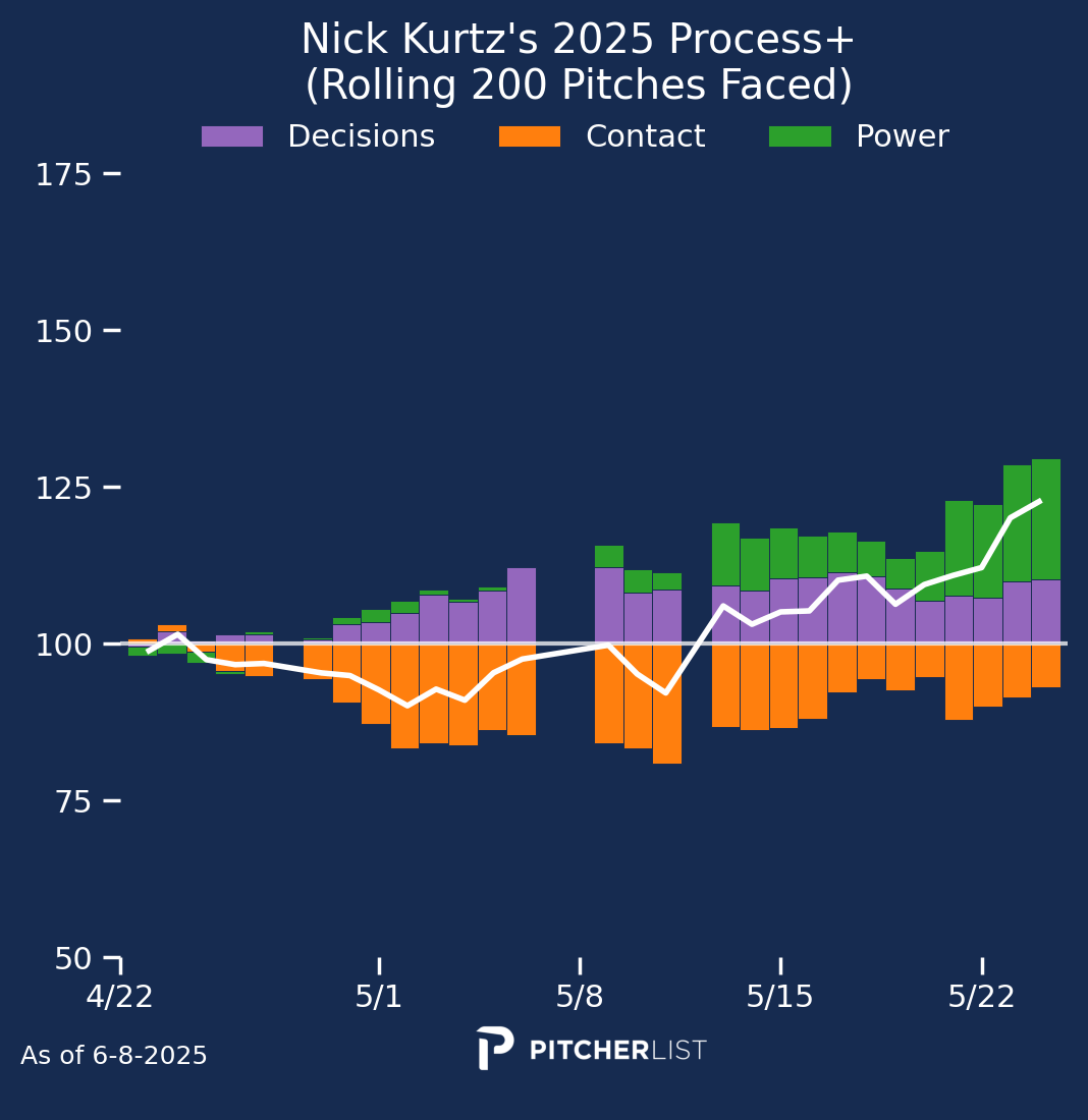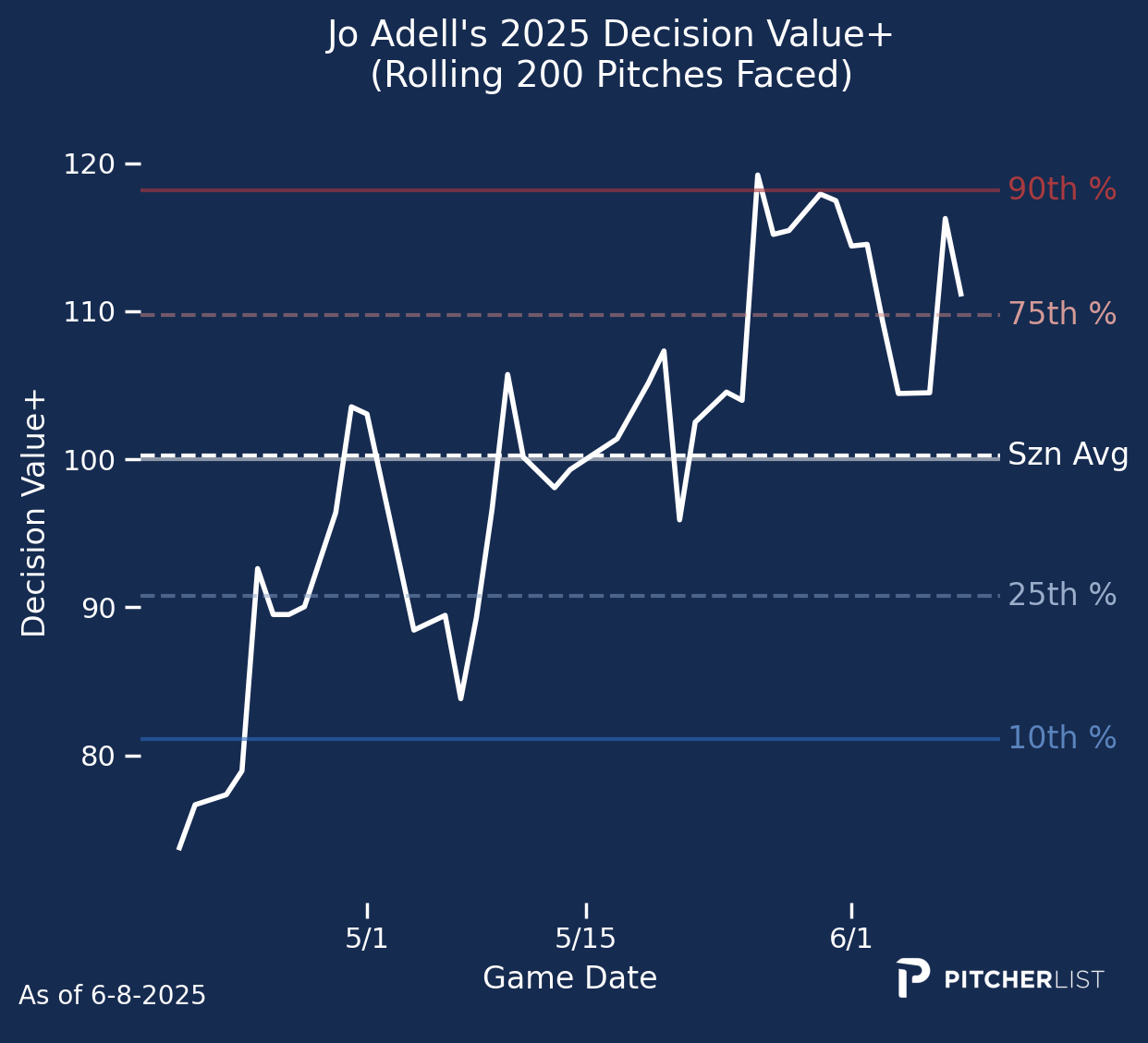 Jo Adell seems to make the back of the list every year, and for now we should be treating this like a hot streak. This streak does happen to be a bit hotter than the one we saw early last year, though one difference is that he’s sustained a rolling zone-contact rate above 80% all season, a feat he has never really accomplished for this long at any point prior. Contact is Adell’s biggest weakness, and as I mentioned earlier, players with big power can see big swings in their production with even modest improvements in contact. The icing on the top, at the moment, is it comes with improved decision-making! I’d say this is a breakout watch, which like a tornado watch, means all the conditions are here for a breakout.