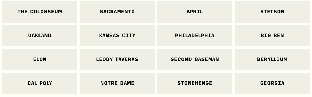 And here is the link to the version I made for your recap today. It’s on an interactive site, and the main difference between that site and the NYT version is that this version will not cut you off after four wrong guesses. You can continue guessing forever. So if you give up, come back here for the answers. And if you want, I’ve embedded the analog version below as a static image, though you won’t know if you have a group right, thus helping you get the other groups by having eliminated four words. Here’s the link to the interactive one again. Use the interactive one.