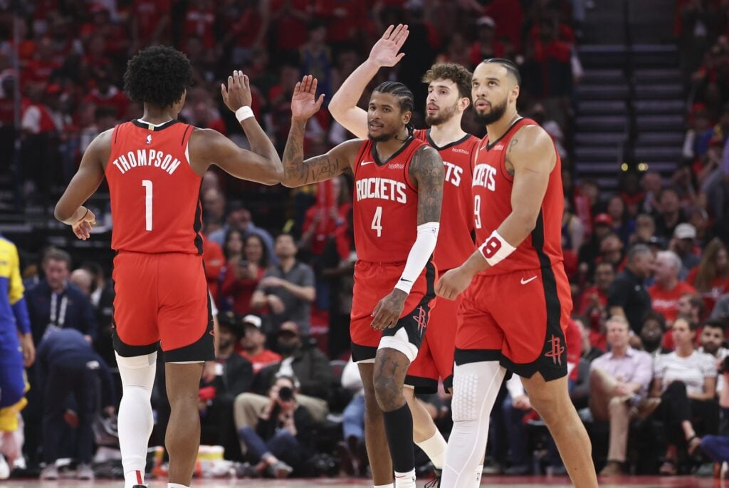 Apr 23, 2025; Houston, Texas, USA; Houston Rockets guard Jalen Green (4) and forward Amen Thompson (1) react after a play during the fourth quarter during game two of the first round for the 2024 NBA Playoffs against the Golden State Warriors at Toyota Center. Mandatory Credit: Troy Taormina-Imagn Images