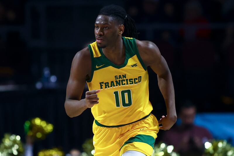 San Francisco forward Jonathan Mogbo runs up the court during the second half of an NCAA college basketball game against Gonzaga in the semifinals of the West Coast Conference men’s tournament Monday, March 11, 2024, in Las Vegas. | Ellen Schmidt, AP