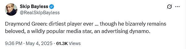 ‘Draymond Green: dirtiest player ever … though he bizarrely remains beloved, a wildly popular media star, an advertising dynamo,’ longtime sports broadcaster Skip Bayless said.Â