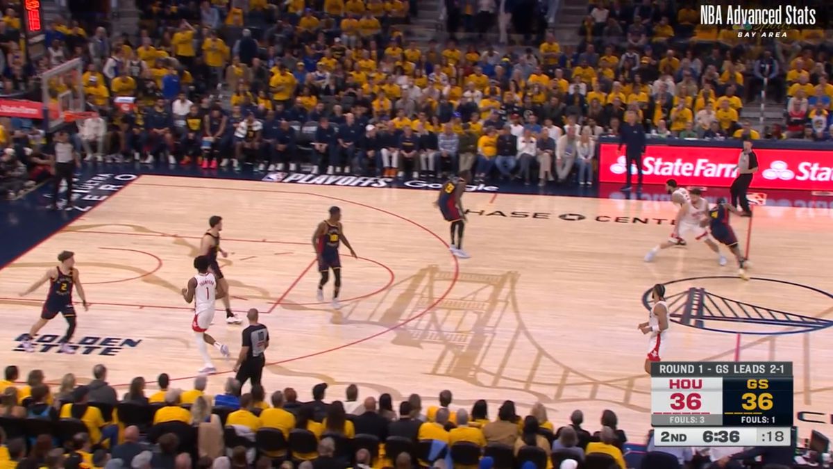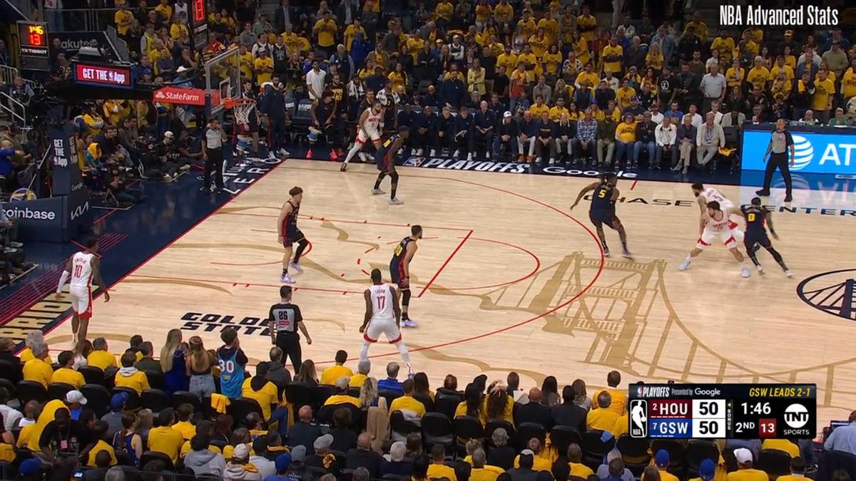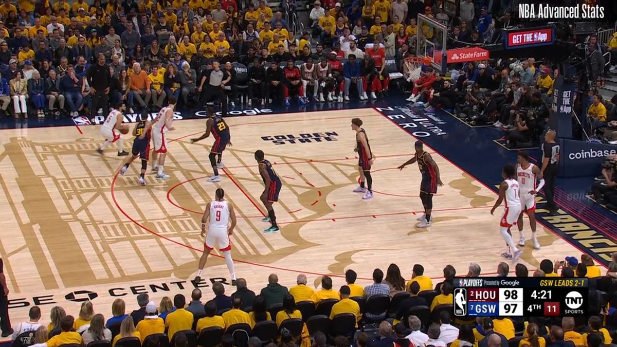 The inverted pick-and-roll possession above — and the one that came before it — ultimately informs what the Warriors decide to do when Udoka goes back to the inverted pick-and-roll in a crucial juncture of the game, with his Rockets down by a single point and needing to score.