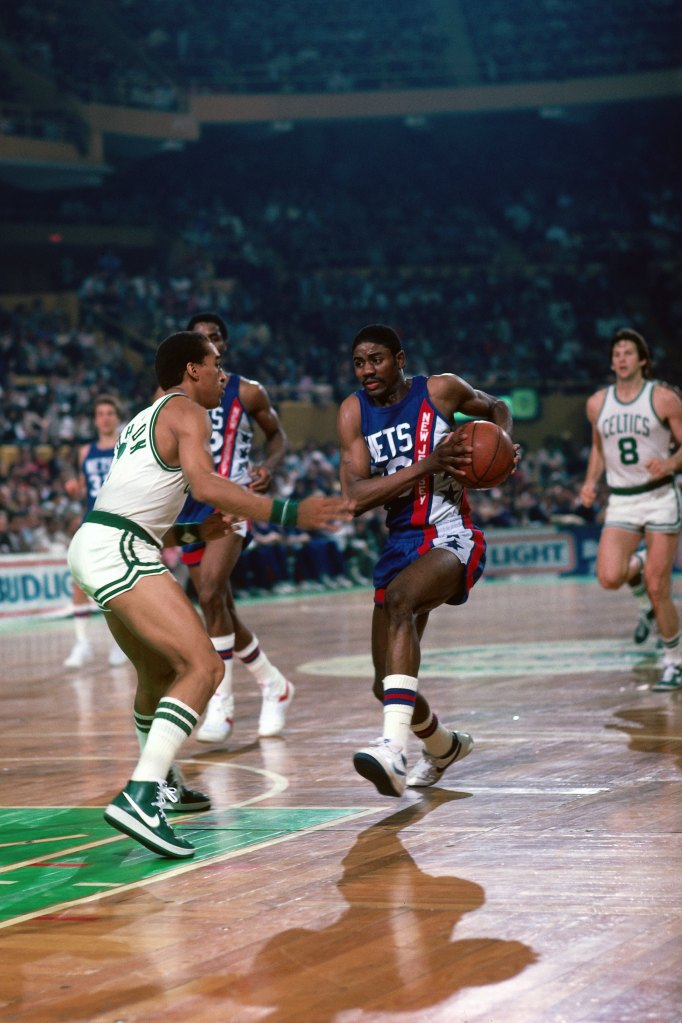 Micheal Ray Richardson of the New Jersey Nets (right) drives to the basket against Dennis Johnson of the Boston Celtics (left) during a game in 1984 at the Boston Garden in Boston.