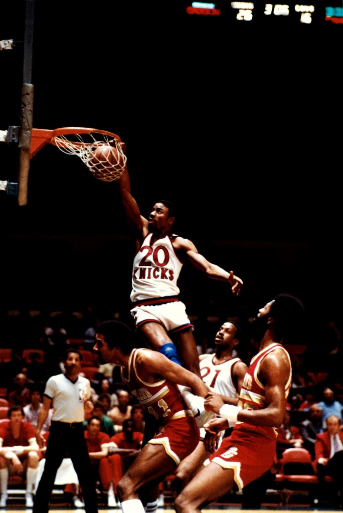 Micheal Ray Richardson of the New York Knicks dunks against the Cleveland Cavaliers during a NBA game circa 1980 at Madison Square Garden in New York.