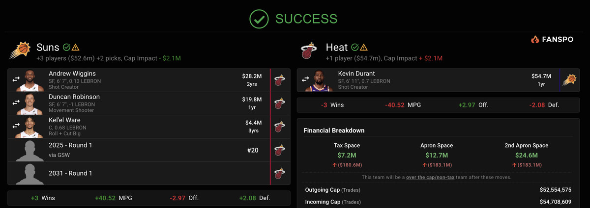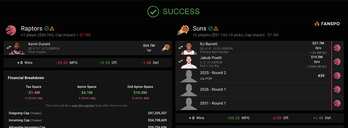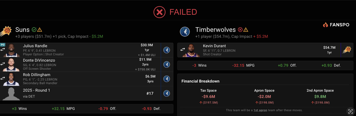 Would the Knicks really get out of the Karl-Anthony Towns experience after only one pretty successful season? KAT was spectacular offensively for New York on the way to their deepest playoff run in 25 years, and he could be an appealing return for a Suns team that can’t tank without control of their first round picks through 2032. For as special as KAT can be as an offensive player, he brings two issues that call the Knicks’ championship ceiling into question: a) he’s a poor defender that struggles to survive in lineups alongside co-star Jalen Brunson, and b) he has an enormous contract with three years, $171 remaining. Durant is about to turn 37 years old, but he’s still an elite shooter and scorer who could play off Brunson’s scoring gravity effectively and balance out lineups. The Knicks would suddenly be extremely reliant on Mitchell Robinson, and that’s a tricky proposition. I have a hard time believing this deal really makes New York better. The Knicks should probably worry about hiring a head coach first before swinging another blockbuster trade.