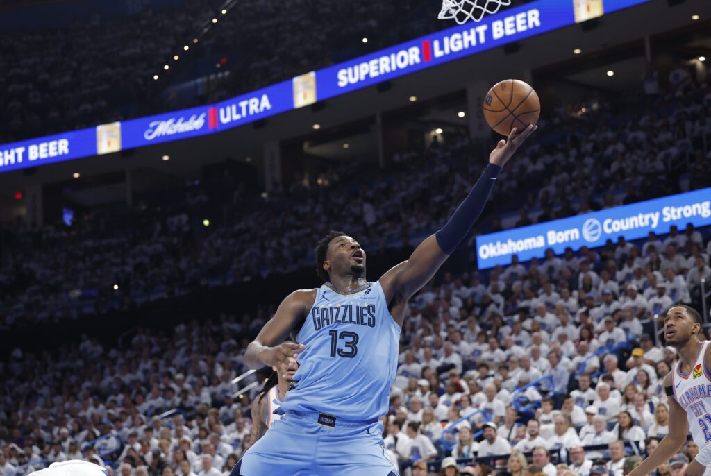 Apr 20, 2025; Oklahoma City, Oklahoma, USA; Memphis Grizzlies forward Jaren Jackson Jr. (13) shoots against the Oklahoma City Thunder during the second half at Paycom Center. Mandatory Credit: Alonzo Adams-Imagn Images