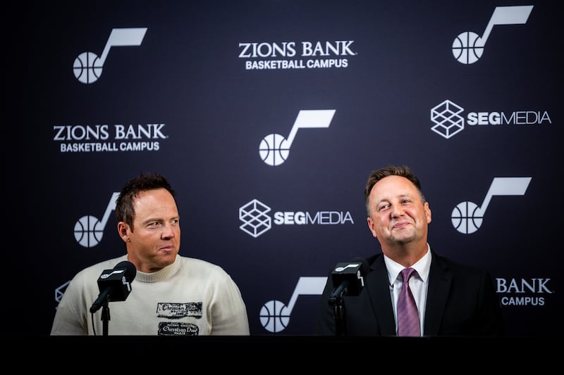 Austin Ainge, president of basketball operations for the Utah Jazz, speaks during an introductory media availability with Utah Jazz Governor Ryan Smith, left, at Zions Bank Basketball Campus in Salt Lake City on Monday, June 2, 2025. | Tess Crowley, Deseret News