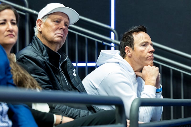 Ryan Smith, right, chairman of Smith Entertainment Group, and Danny Ainge, an executive for the Utah Jazz, listen as Brigham Young University Athletic Director Tom Holmoe speaks during a press conference announcing his retirement at the end of the school year held at the BYU Broadcast Building on the university’s campus in Provo on Wednesday, Feb. 12, 2025. | Isaac Hale, Deseret News