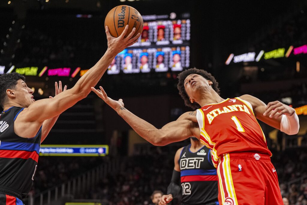 Jan 22, 2025; Atlanta, Georgia, USA; Atlanta Hawks forward Jalen Johnson (1) and Detroit Pistons forward Simone Fontecchio (19) go after a rebound during the second half at State Farm Arena. Mandatory Credit: Dale Zanine-Imagn Images