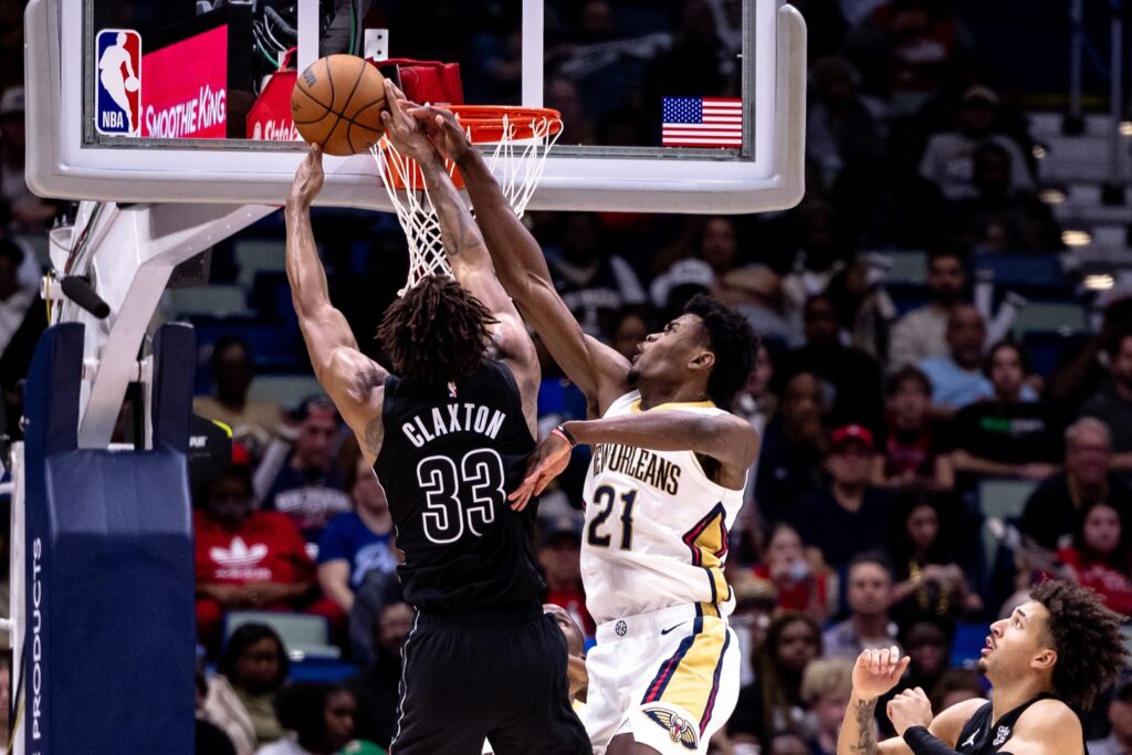 Nov 11, 2024; New Orleans, Louisiana, USA; New Orleans Pelicans center Yves Missi (21) blocks the shot of Brooklyn Nets center Nic Claxton (33) during the second half at Smoothie King Center. Mandatory Credit: Stephen Lew-Imagn Images
