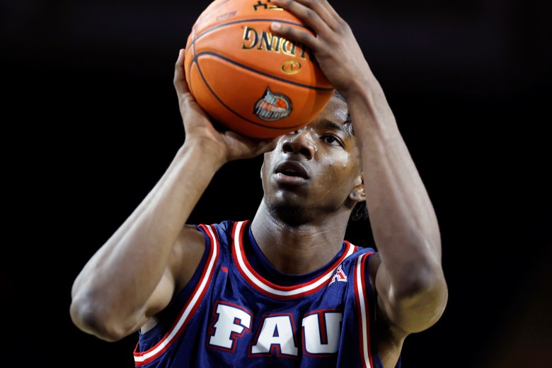 Florida Atlantic’s Brenen Lorient makes a free-throw during the first half of an NCAA college basketball game against the St. Bonaventure in the Basketball Hall of Fame Classic, Saturday, Dec. 16, 2023, in Springfield, Mass.(AP Photo/Michael Dwyer)
