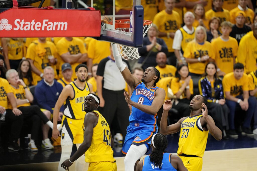 Jun 19, 2025; Indianapolis, Indiana, USA; Oklahoma City Thunder forward Jalen Williams (8) shoots the ball against the Indiana Pacers during the first half of game six of the 2025 NBA Finals between the Oklahoma City Thunder and the Indiana Pacers at Gainbridge Fieldhouse. Mandatory Credit: Kyle Terada-Imagn Images