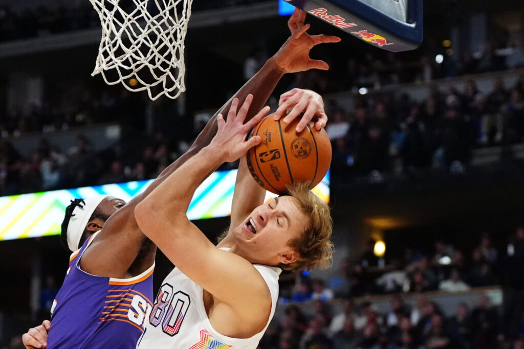 Dec 23, 2024; Denver, Colorado, USA; Phoenix Suns forward Josh Okogie (2) and Denver Nuggets forward Hunter Tyson (5) reach for a rebound in the second quarter at Ball Arena. Mandatory Credit: Ron Chenoy-Imagn Images