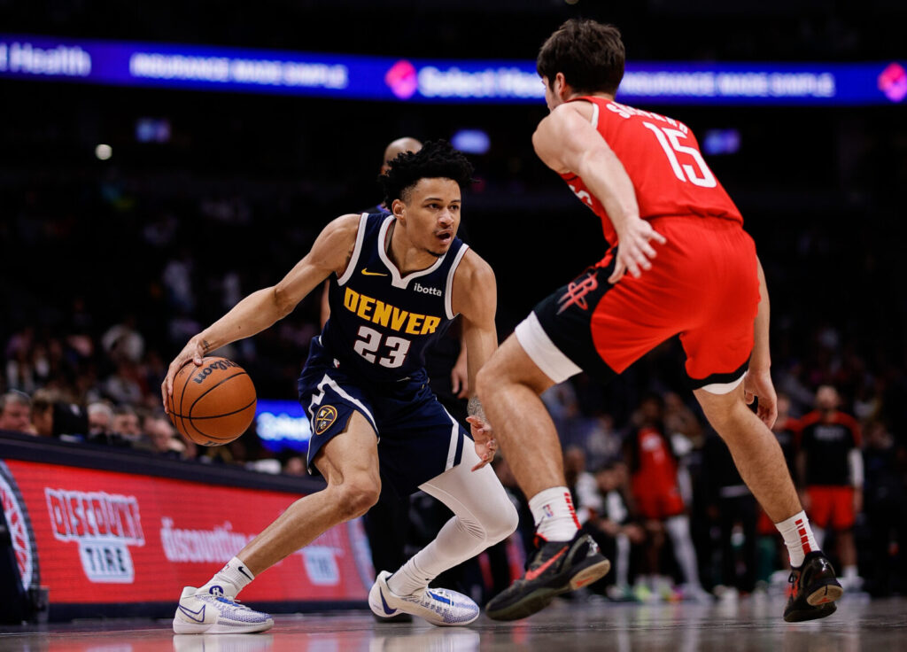 Jan 15, 2025; Denver, Colorado, USA; Denver Nuggets guard Trey Alexander (23) controls the ball against Houston Rockets guard Reed Sheppard (15) in the fourth quarter at Ball Arena. Mandatory Credit: Isaiah J. Downing-Imagn Images