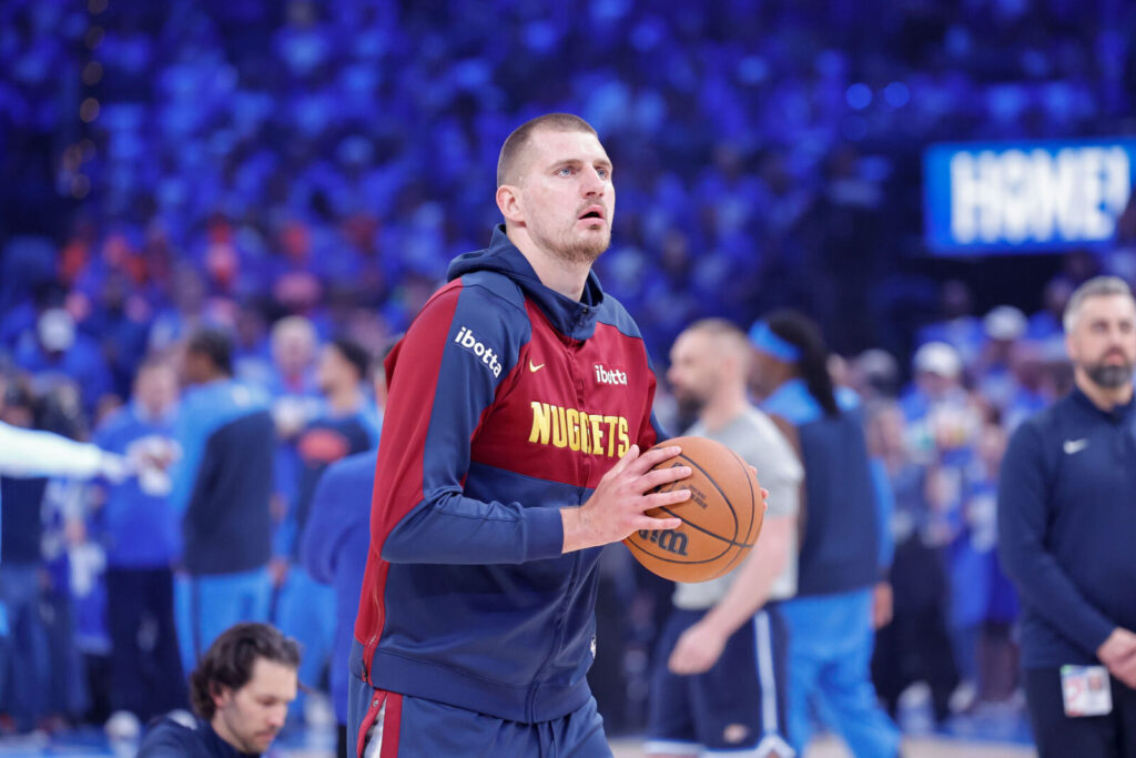 May 18, 2025; Oklahoma City, Oklahoma, USA; Denver Nuggets center Nikola Jokic (15) warms up before game seven of the second round against the Oklahoma City Thunder for the 2025 NBA Playoffs at Paycom Center. Mandatory Credit: Alonzo Adams-Imagn Images