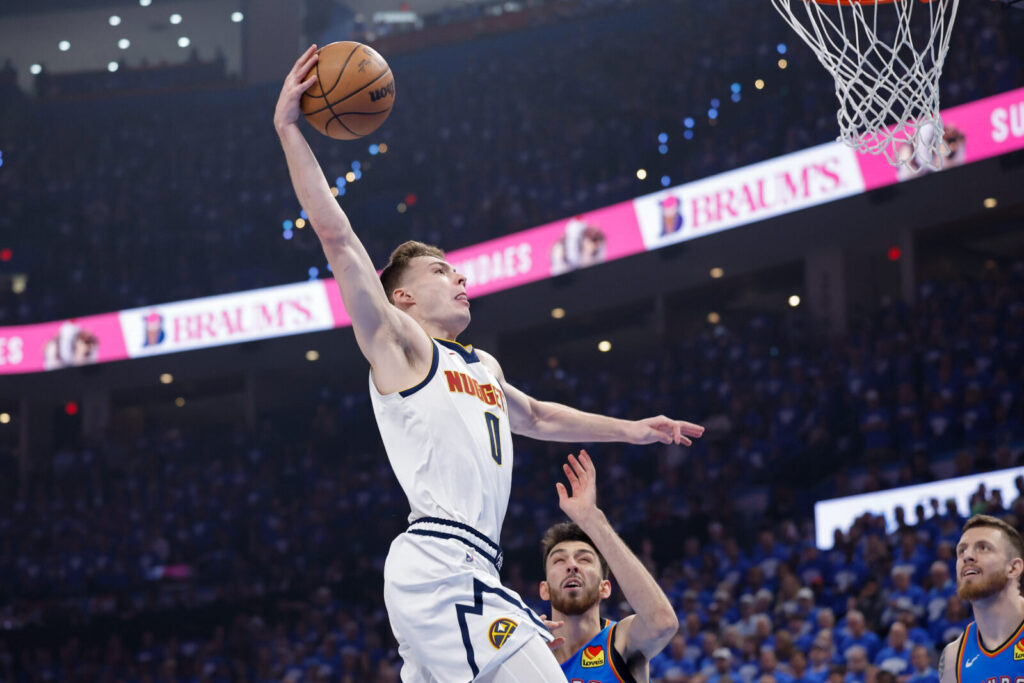 May 18, 2025; Oklahoma City, Oklahoma, USA; Denver Nuggets guard Christian Braun (0) goes to the basket for a dunk against the Oklahoma City Thunder in the first quarter during game seven of the second round for the 2025 NBA Playoffs at Paycom Center. Mandatory Credit: Alonzo Adams-Imagn Images