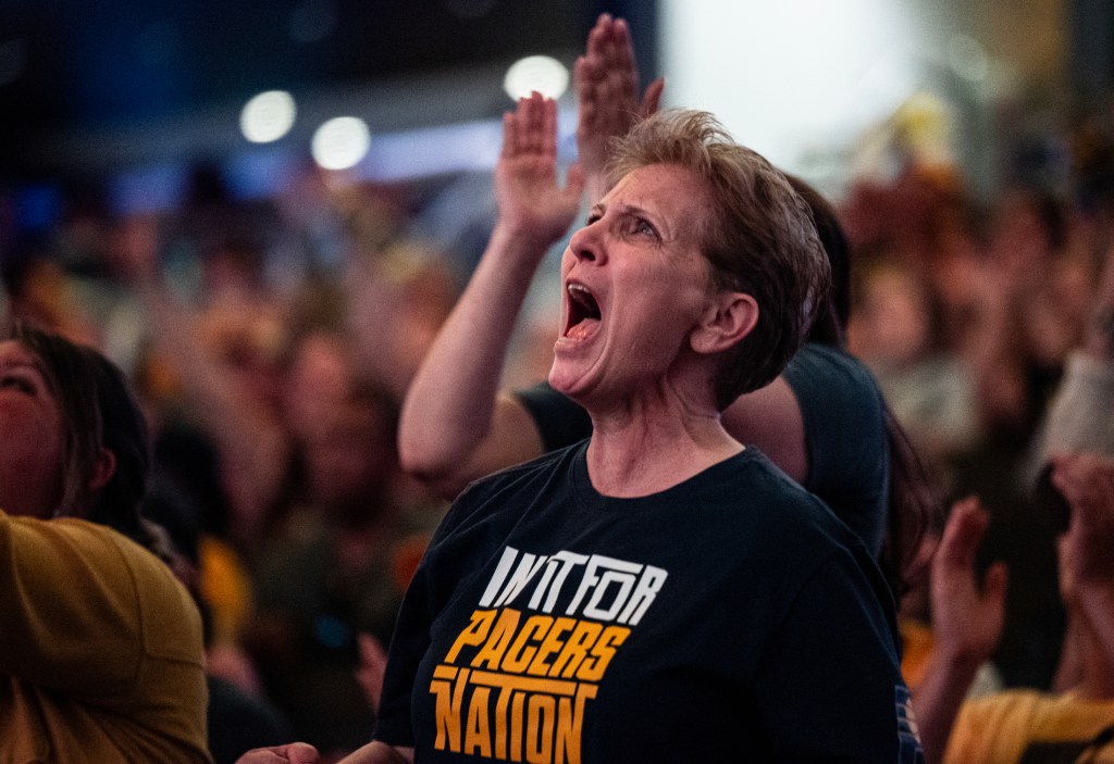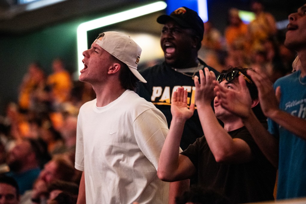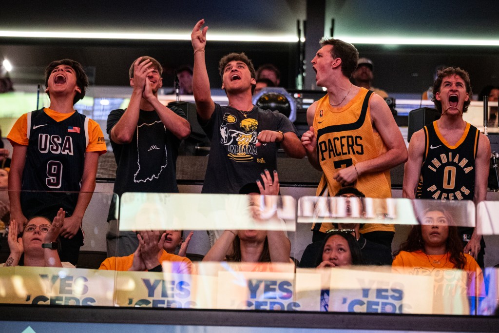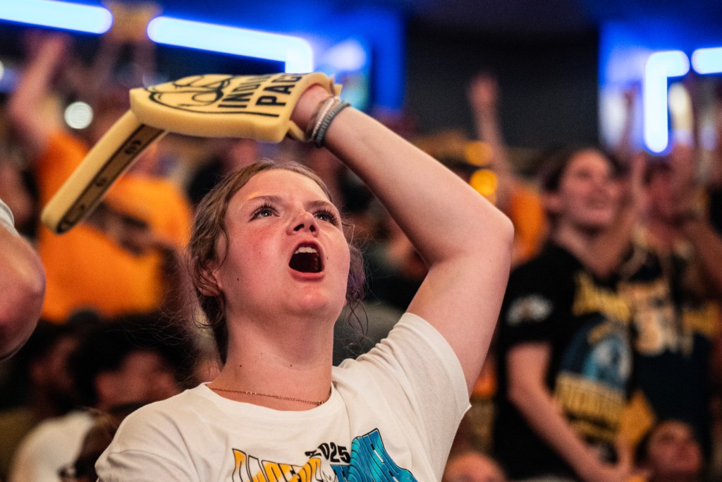 Indiana Pacers fans celebrate a made basket during the Indiana Pacers Game 7 watch party June 22, 2025, at Gainbridge Fieldhouse. Credit: Nate Pappas for Mirror Indy