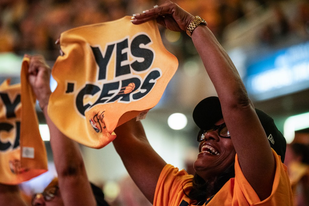 Theresa Watson waves her “Yes ‘Cers” towel during the Indiana Pacers Game 7 watch party June 22, 2025, at Gainbridge Fieldhouse. Credit: Nate Pappas for Mirror Indy